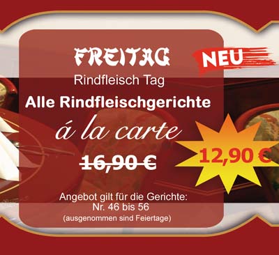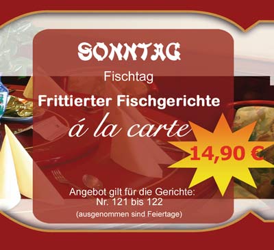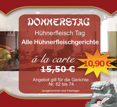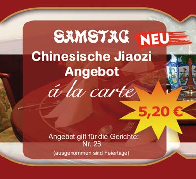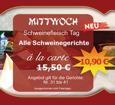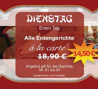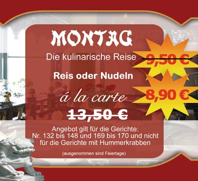 Die reichhaltige Speisekarte läßt kaum Wünsche offen. Dazu werden Spezialitäten aus der Region Peking und Szechuan angeboten. Zubereitungsformen aus dem Wok und von der heißen Platte sind selbstverständlich.